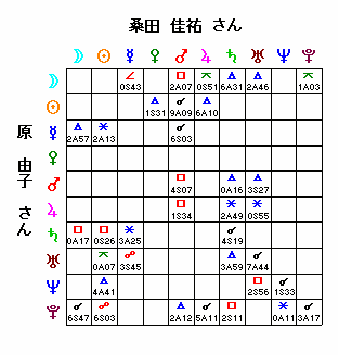 おばちゃん;火のエレメントが強いもん同士やけど、特に、桑田さんの金星と原さんの太陽のトラインが印象的やで。っと、やっぱり、相性の話になってまうなぁ。よっしゃ、お二人のシナストリーはこんなんや。